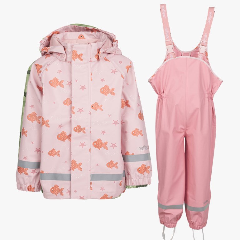 Printet regnsett i myk og solid PU-kvalitet med sveisede sømmer, produsert i resirkulert materiale. Bukse og jakke har børstet innside som gir plaggene en lunere opplevelse. Jakken har glidelås i front med innvendig og utvendig stormklaff og borrelås. All backing på regntøyet er laget av resirkulert materiale, og utgjør mer enn 70% av det totale plagget.