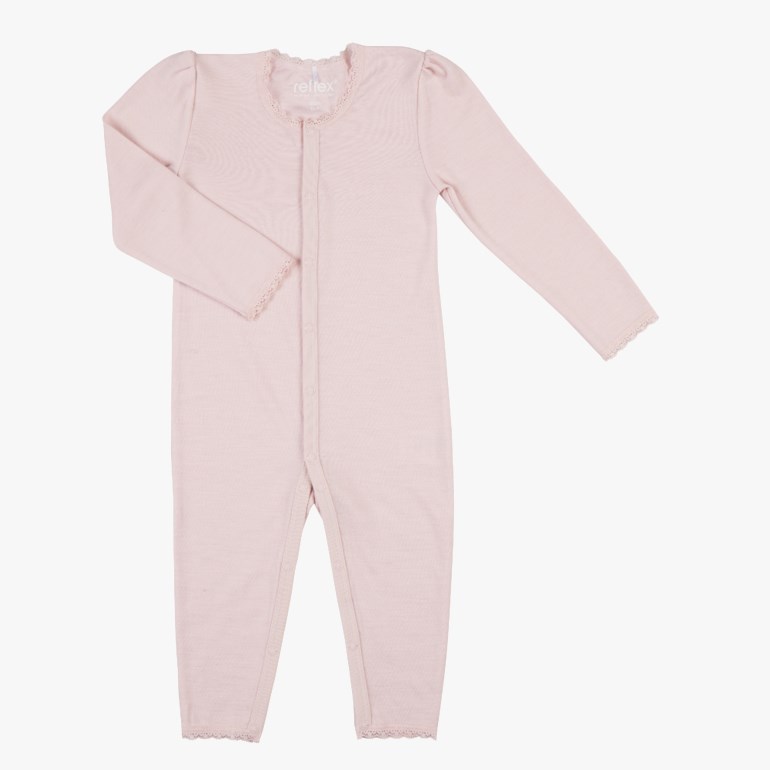 Ensfarget heldress med blonder. Bambusviskose på innsiden og merinoull på utsiden. Denne kombinasjonen av materialer beskytter sensitiv og tørr hud mot irritasjon samtidig som man får godt utbytte av ullens gode egenskaper.