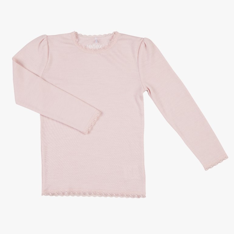 Ensfarget, langermet trøye med blonder, med bambusviskose på innsiden og merinoull på utsiden. Denne kombinasjonen av materialer beskytter sensitiv og tørr hud mot irritasjon samtidig som man får godt utbytte av ullens gode egenskaper.