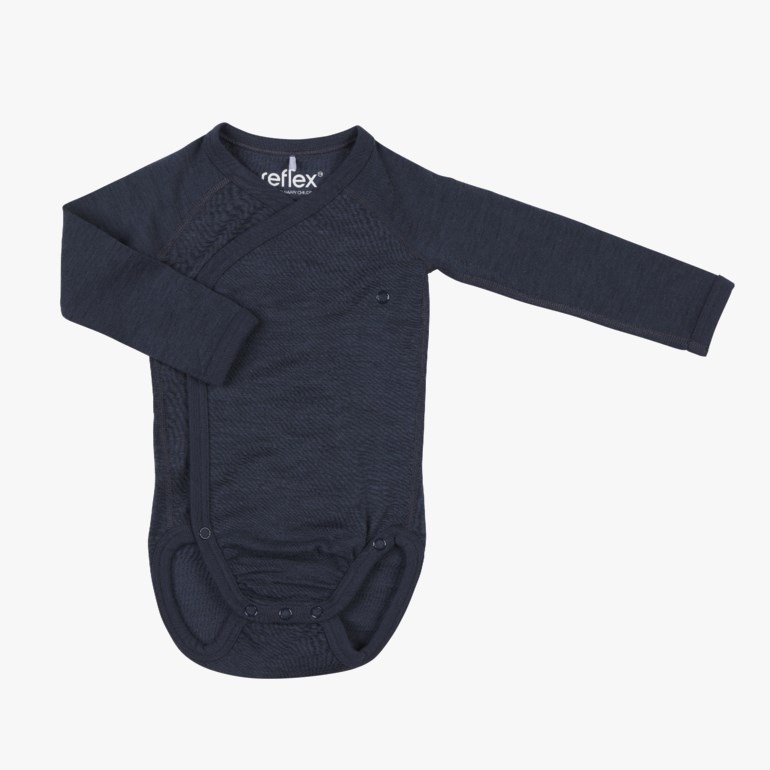 Ensfarget omslagsbody med bambusviskose på innsiden og merinoull på utsiden. Denne kombinasjonen av materialer beskytter sensitiv og tørr hud mot irritasjon samtidig som man får godt utbytte av ullens gode egenskaper.