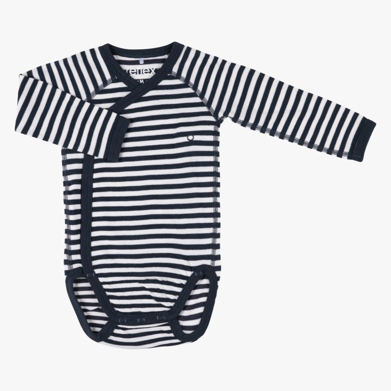 Stripet omslagsbody som kombinerer ullens fantastiske egenskaper med bambusviskosens myke og behagelige komfort.