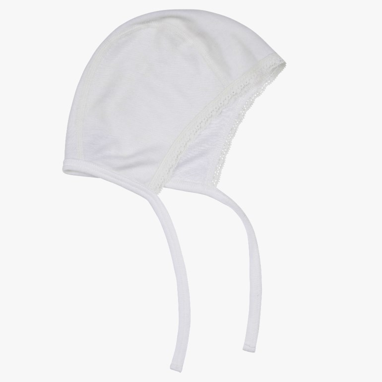 Ensfarget ull/bambus lue til baby fra Reflex. Fin som hjelmlue og kommer med søte blonder.