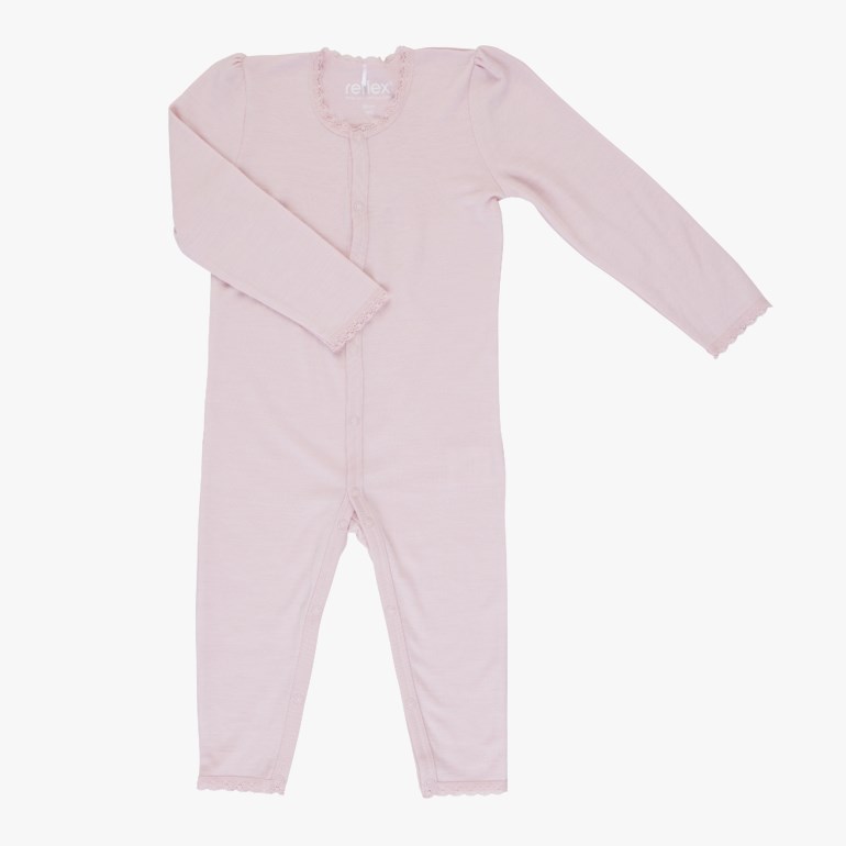 Ensfarget heldress med blonder. Bambusviskose på innsiden og sertifisert merinoull på utsiden. Denne kombinasjonen av naturmaterialer beskytter sensitiv og tørr hud mot irritasjon samtidig som man får godt utbytte av ullens gode egenskaper.