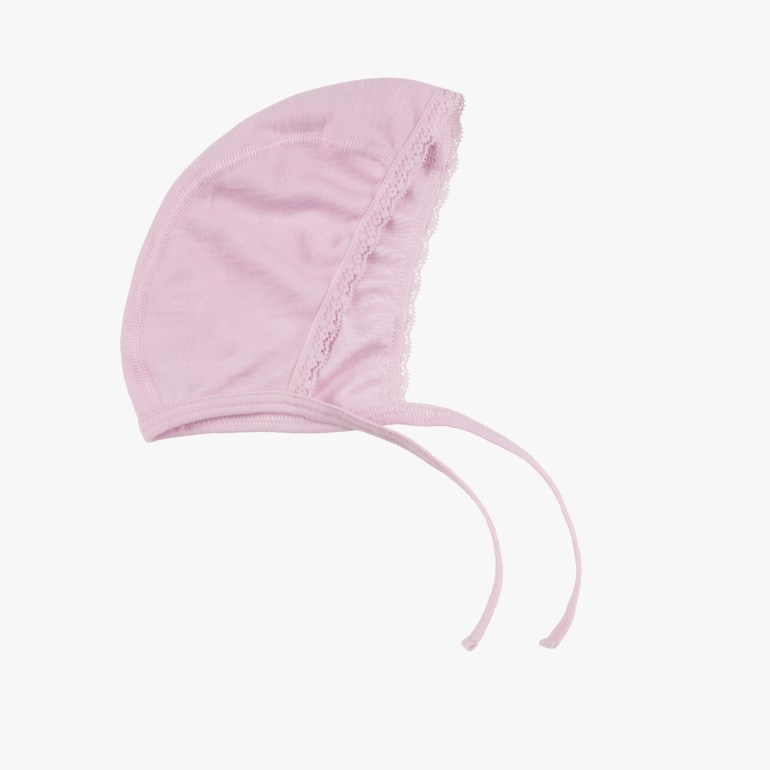Myk og behagelig, ensfarget babylue med blonder, med bambusviskose på innsiden og RWS-sertifisert merinoull på utsiden. Hjelmluen kombinerer ullens fantastiske egenskaper med bambusviskosens myke og behagelige komfort, og den passer fint som lue til nyfødt. Gir barn med sensitiv og/eller tørr hud, godt utbytte av ullens lune egenskaper samtidig som bambusviskose beskytter huden mot irritasjon.