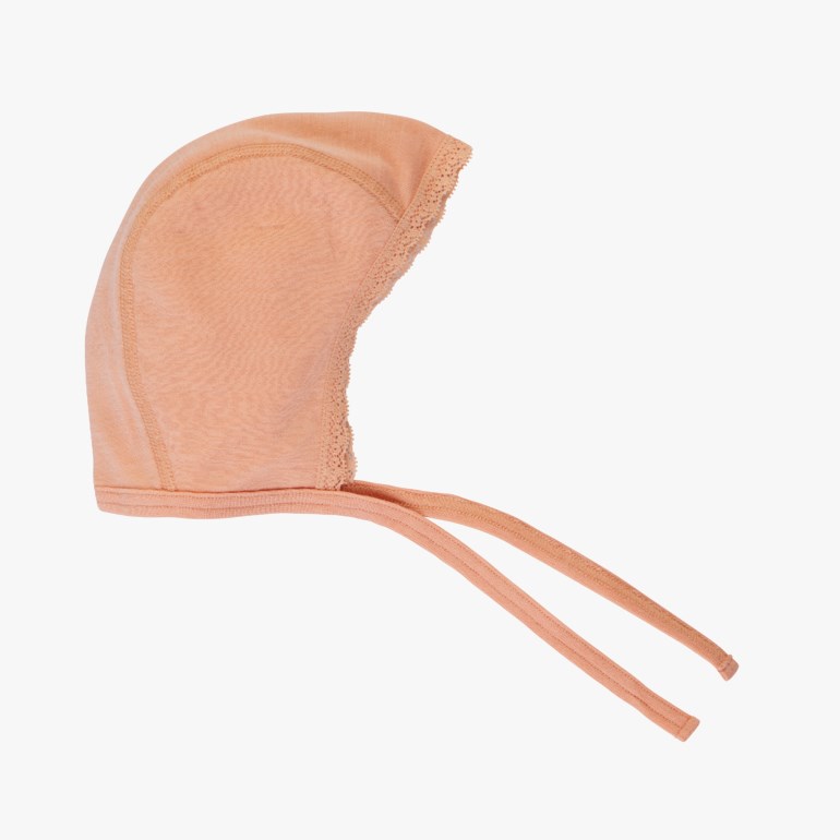 Myk og behagelig ensfarget babylue med blonder, med bambusviskose på innsiden og sertifisert merinoull på utsiden. Hjelmluen kombinerer ullens fantastiske egenskaper med bambusviskosens myke og behagelige komfort, og passer fint som lue til nyfødt.
