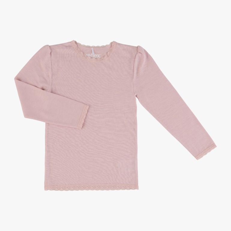 Ensfarget, langermet trøye med blonder, med bambusviskose på innsiden og ull på utsiden. Denne kombinasjonen av naturmaterialer beskytter sensitiv og tørr hud mot irritasjon samtidig som man får godt utbytte av ullens gode egenskaper. Kombinerer ullens fantastiske egenskaper med bambusviskosens myke og behagelige komfort. Gir barn med sensitiv og/eller tørr hud, godt utbytte av ullens lune egenskaper samtidig som bambusviskose beskytter huden mot irritasjon. Alle plaggets detaljer som vender inn mot barnets hud, er bambus Transporterer bort fuktighet og tørker hurtig. Produktet er Økotex-sertifisert. Ullen er RWS-sertifisert & mulesing-fri for en mer bærekraftig produksjon. Materiale: 50% merinoull, 45% bambusviskose, 5% polyamid. Vaskeanvisning: Maskinvask 30 grader, ullprogram. For å ivareta både plagget og miljøet så godt som mulig anbefaler vi å minimere antall vask så mye man kan. Vask gjerne av flekker med en klut og heng plagget til lufting når nødvendig. Dette vil forlenge levetiden på plagget, minimere energibruk samt skåne miljøet for unødvendig utslipp.