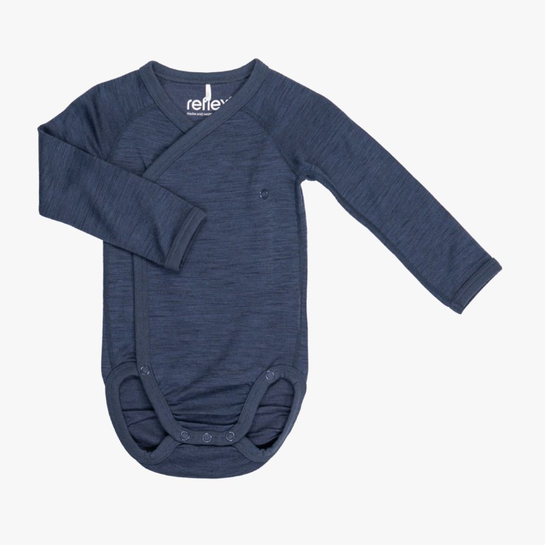 Ensfarget omslagsbody med bambusviskose på innsiden og merinoull på utsiden. Denne kombinasjonen av materialer beskytter sensitiv og tørr hud mot irritasjon samtidig som man får godt utbytte av ullens gode egenskaper. Alle hals/ermer/fotåpninger i Bris-serien er laget av bomull slik at man unngår ull inn mot barnets hud.