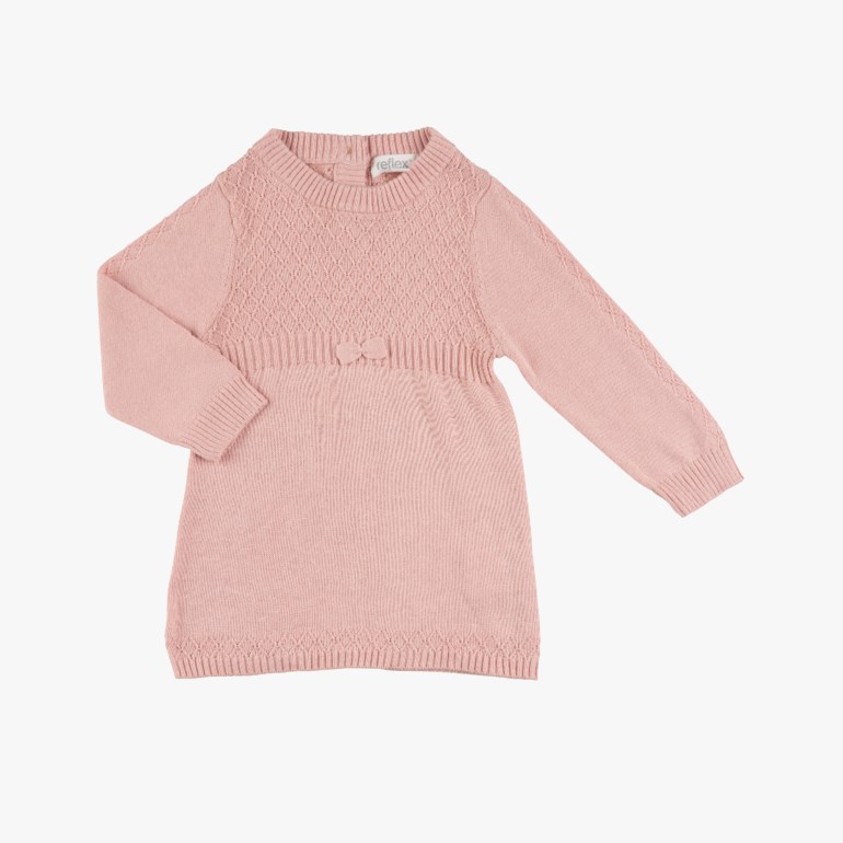 Nydelig kjole for de minste i mønsterstrikket mix av viskose og bomull. Lett og behagelig kvalitet i viskose og bomull. Knappeåpning i ryggen. Dekorativ sløyfe i front. Matcher til resten av plaggene i Filibom-serien. Økotex-sertifisert produkt uten skadelige kjemikalier eller allergifremkallende stoffer. Str 56 cm 1 mnd – 92 cm 2 år. Materiale: 60% viskose, 40% bomull. Vaskeanvisning: Maskinvask, 40 grader skånsom vask. For å ivareta både plagget og miljøet så godt som mulig, anbefaler vi å minimere antall vask så mye man kan. Vask gjerne av flekker med en klut og heng plagget til lufting når nødvendig. Dette vil forlenge levetiden på plagget, minimere energibruk samt skåne miljøet for unødvendig utslipp.