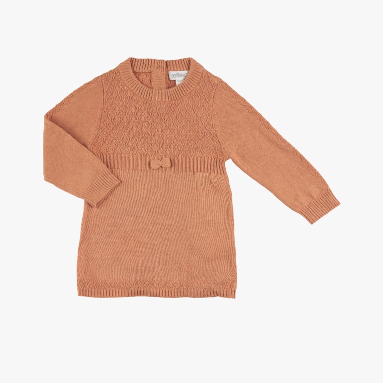 Nydelig kjole for de minste i mønsterstrikket mix av viskose og bomull. Lett og behagelig kvalitet i viskose og bomull. Knappeåpning i ryggen. Dekorativ sløyfe i front. Matcher til resten av plaggene i Filibom-serien. Økotex-sertifisert produkt uten skadelige kjemikalier eller allergifremkallende stoffer. Str 56 cm 1 mnd – 92 cm 2 år. Materiale: 60% viskose, 40% bomull. Vaskeanvisning: Maskinvask, 40 grader skånsom vask. For å ivareta både plagget og miljøet så godt som mulig, anbefaler vi å minimere antall vask så mye man kan. Vask gjerne av flekker med en klut og heng plagget til lufting når nødvendig. Dette vil forlenge levetiden på plagget, minimere energibruk samt skåne miljøet for unødvendig utslipp.