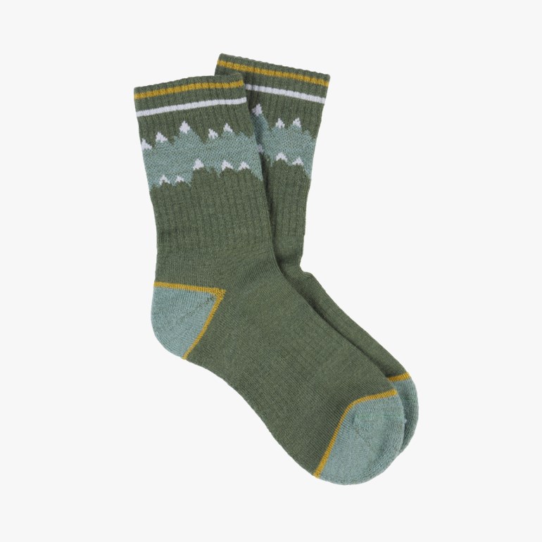 Varme, myke og kløfrie ullsokker med fjellmotiv. Ekstra frottèsåle gir bedre isolasjon, og forsterkning i hæl og tær minimerer slitasje. Ribbestrikket ankelparti sikrer en ekstra god passform.