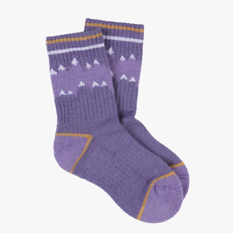 Varme, myke og kløfrie ullsokker med fjellmotiv. Ekstra frottèsåle gir bedre isolasjon, og forsterkning i hæl og tær minimerer slitasje. Ribbestrikket ankelparti sikrer en ekstra god passform.