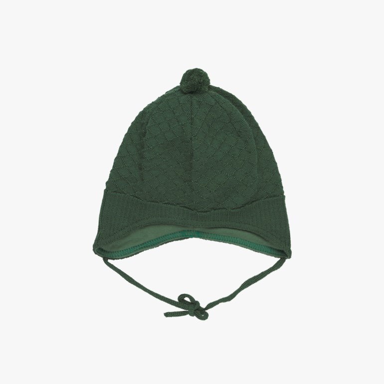 Ensfarget lue i lett og behagelig mønsterstrikk med øreklaffer og snøring. Innsiden er bomullsbelagt og ekstra myk. Laget av en myk blanding ull/akryl/økologisk bomull. Produktet er økotex-sertifisert , helt uten skadelige kjemikalier eller allergifremkallende stoffer.