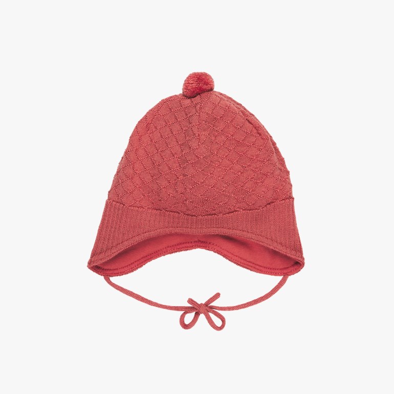 Ensfarget lue i lett og behagelig mønsterstrikk med øreklaffer og snøring. Innsiden er bomullsbelagt og ekstra myk. Laget av en myk blanding ull/akryl/økologisk bomull. Produktet er økotex-sertifisert , helt uten skadelige kjemikalier eller allergifremkallende stoffer.