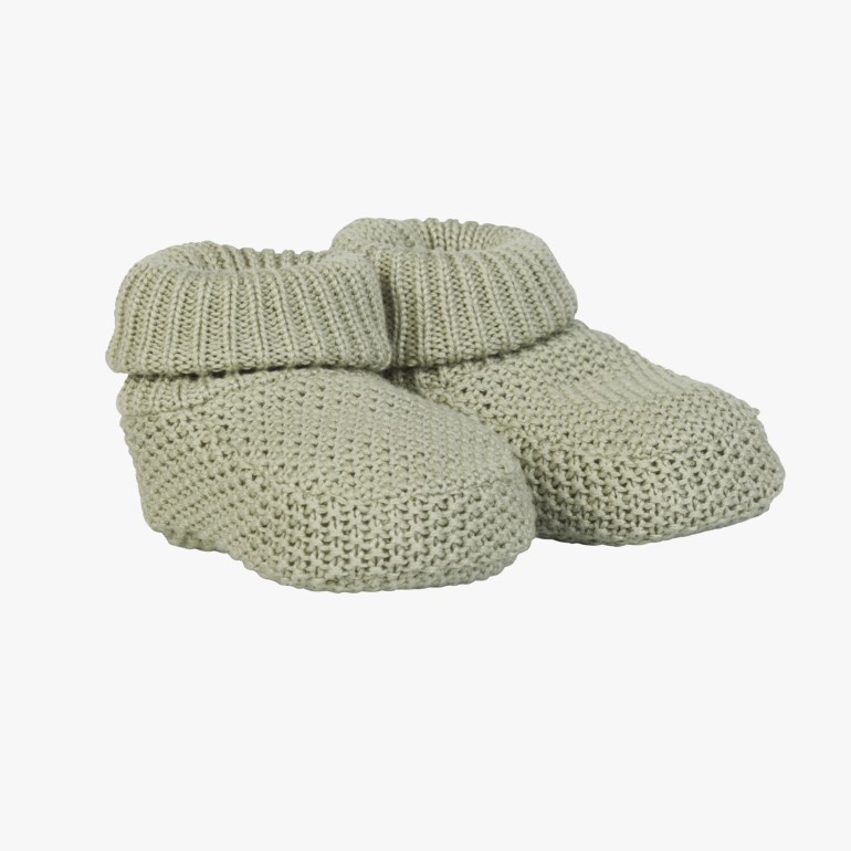 De nydelige Gullharpen tøflene er formstrikket i myk perlestrikk og passer perfekt til små babyføtter. Den ribbestrikkede ankelkanten sørger for at tøflene sitter godt på uten å stramme.