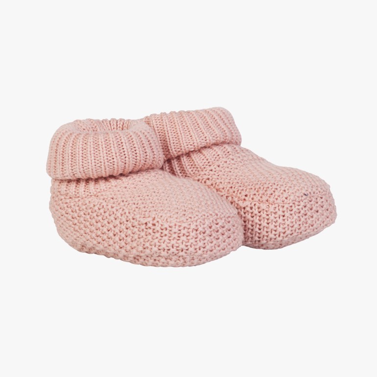 De nydelige Gullharpen tøflene er formstrikket i myk perlestrikk og passer perfekt til små babyføtter. Den ribbestrikkede ankelkanten sørger for at tøflene sitter godt på uten å stramme.