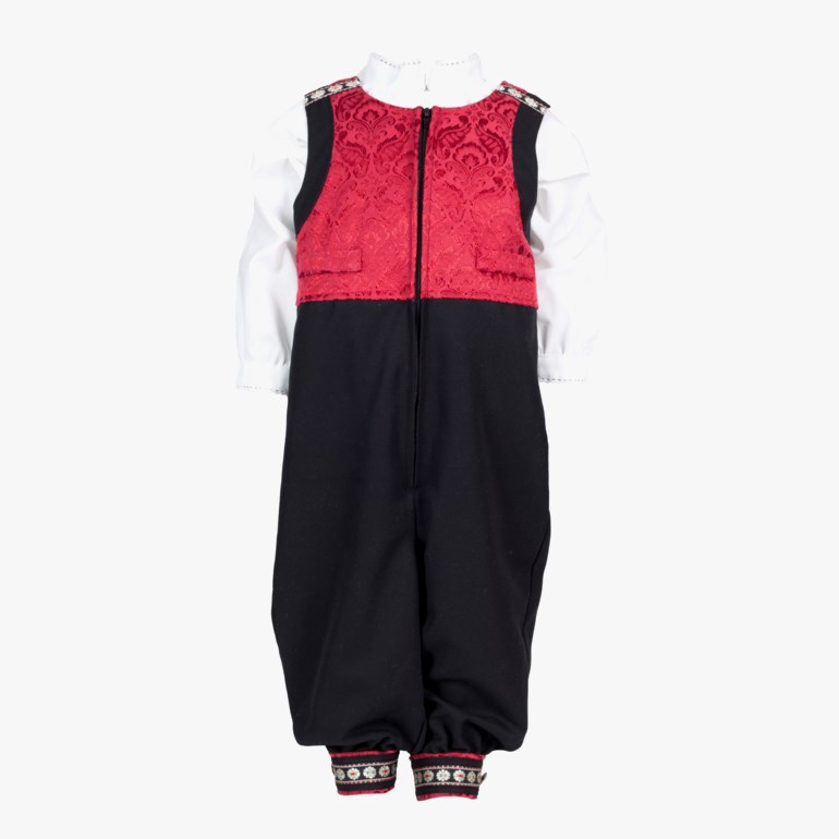 Klassisk festdrakt med body til de minste, i størrelsene 62-86. Sort bukse og rød brokade med fine detaljer. Body har åpning i skrittet. Kvalitet i bomull/polyester og body i 100% bomull. Ekstra body kan kjøpes separat, ref. style 249773.