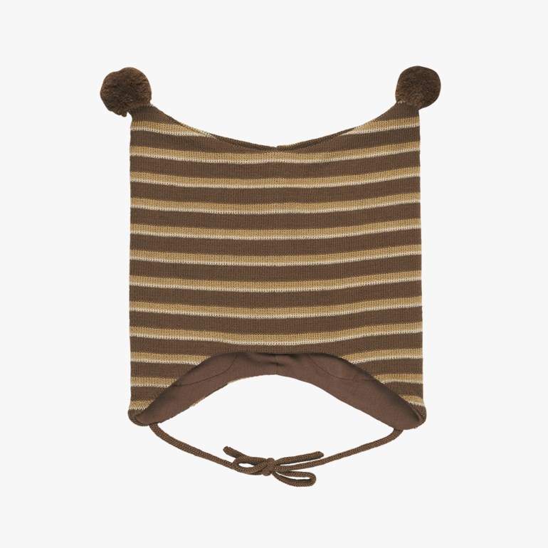 Stripet lue i strikket ullkvalitet med innvendig myk jersey-lining. Innsydde vindstoppere i øreklaffene, holder barnet behagelig varmt og beskytter mot vind. Reflekstråder i duskene for bedre synlighet. Snøring som gjør at luen sitter ekstra godt. Produktet er Økotex- og OCS-sertifisert, og uten skadelige fargestoffer eller allergifremkallende kjemikalier. Vaskeanvisning: Maskinvask 30 grader.