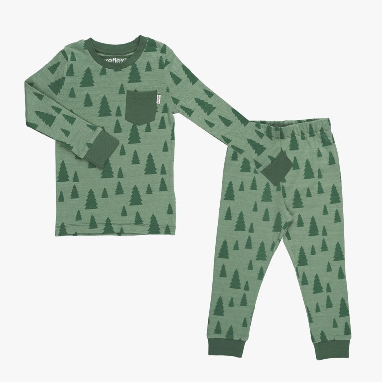 Deilig, myk todelt pysjamas fra Reflex og ensfarget bukse fra Reflex, med fint skogsmønster og stripete innside. Genseren har en fin lomme på bryste, buksen kommer med elastisk linning og bein.