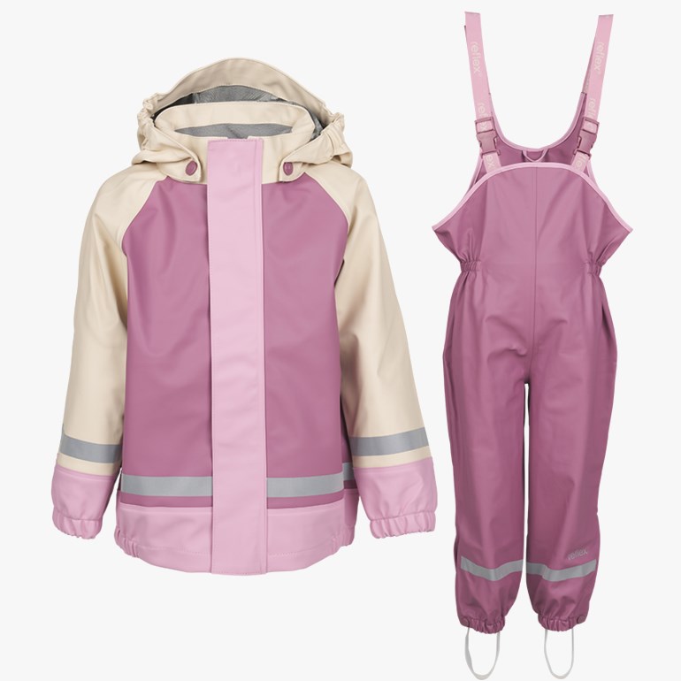 Vanntett og svært slitesterkt PU-regnsett med vår høyeste rive/slite-styrke og sveisede sømmer. Glidelås i front med utvendig og innvendig stormklaff som beskytter godt mot vær og vind og holder vannet ute. Regulerbar og avtakbar hette med elastikk i sidene samt en liten skygge som beskytter mot regn i ansiktet. Fleece på innsiden av kragen for bedre komfort samt beskyttelse i hakeparti mot glidelås. Elastiske avslutninger i ermer. Navnelapp i både jakke, hette og bukse. Buksen har høyt liv med elastikk i livet og justerbare seler. Trykknapper gjør buksen regulerbar nederst i foten. Kraftig silikonstrikk under foten som kan byttes ut etter behov. Både jakke og bukse har godt med reflekser for bedre synlighet. Str. 92 cm 2 år – 128 cm 8 år. Materiale: Utside: 100% polyuretan, Bakside: 100% polyester. Vaskeanvisning: Skånsom maskinvask 40 grader, vaskes separat med innsiden ut. For å ivareta både plagget og miljøet så godt som mulig, anbefaler vi å minimere antall vask så mye man kan. Vask gjerne av flekker med en klut og heng plagget til lufting når nødvendig. Dette vil forlenge levetiden på plagget, minimere energibruk samt skåne miljøet for unødvendig utslipp.
