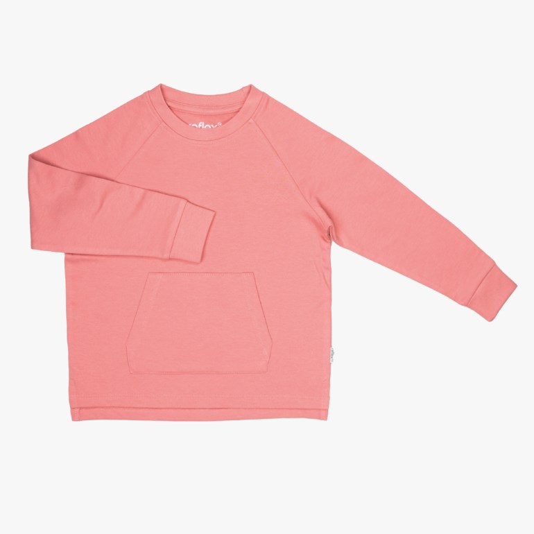Myk og behagelig collegegenser laget av 100% økologisk bomull. Perfekt hverdagsplagg til lek, kos og aktivitet med kengurulomme i front.