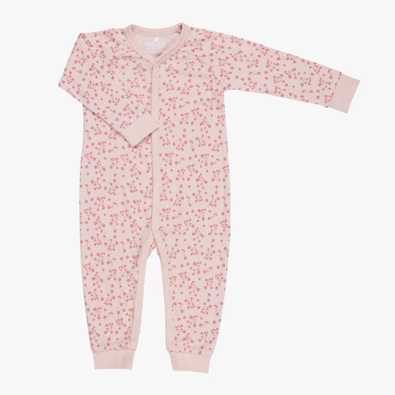 Helprintet ulldress laget av bambusviskose på innsiden og merinoull på utsiden. Denne kombinasjonen av materialer beskytter sensitiv og tørr hud mot irritasjon samtidig som man får godt utbytte av ullens gode egenskaper. Alle hals/ermer/fotåpninger i Nysnø-serien er laget av bomull slik at man unngår ull inn mot barnets hud.