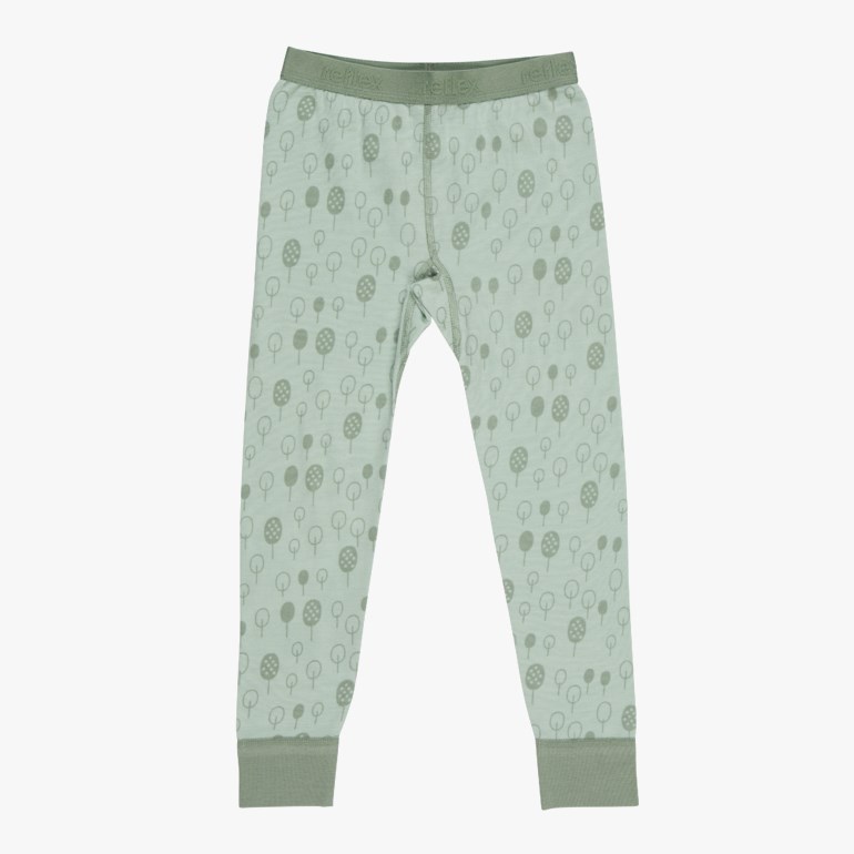 Helprintet ull-longs laget av bambusviskose på innsiden og merinoull på utsiden. Denne kombinasjonen av materialer beskytter sensitiv og tørr hud mot irritasjon samtidig som man får godt utbytte av ullens gode egenskaper. Alle hals/ermer/fotåpninger i Nysnø-serien er laget av bomull slik at man unngår ull inn mot barnets hud.