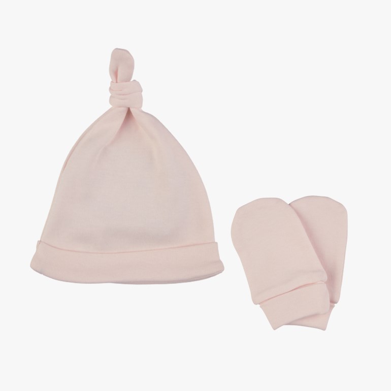 Sett med lue og klorevotter i ensfarget, 100% økologisk bomull. Luen kommer med søt knytetopp. Produktet er Økotex- og GOTS-sertifisert.