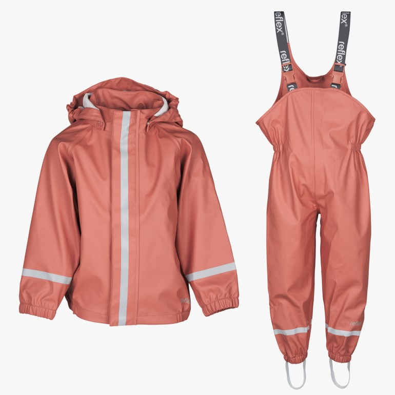 Mykt og behagelig PU-regnsett med backing av resirkulert materiale, sveisede sømmer og rikelig med reflekser.