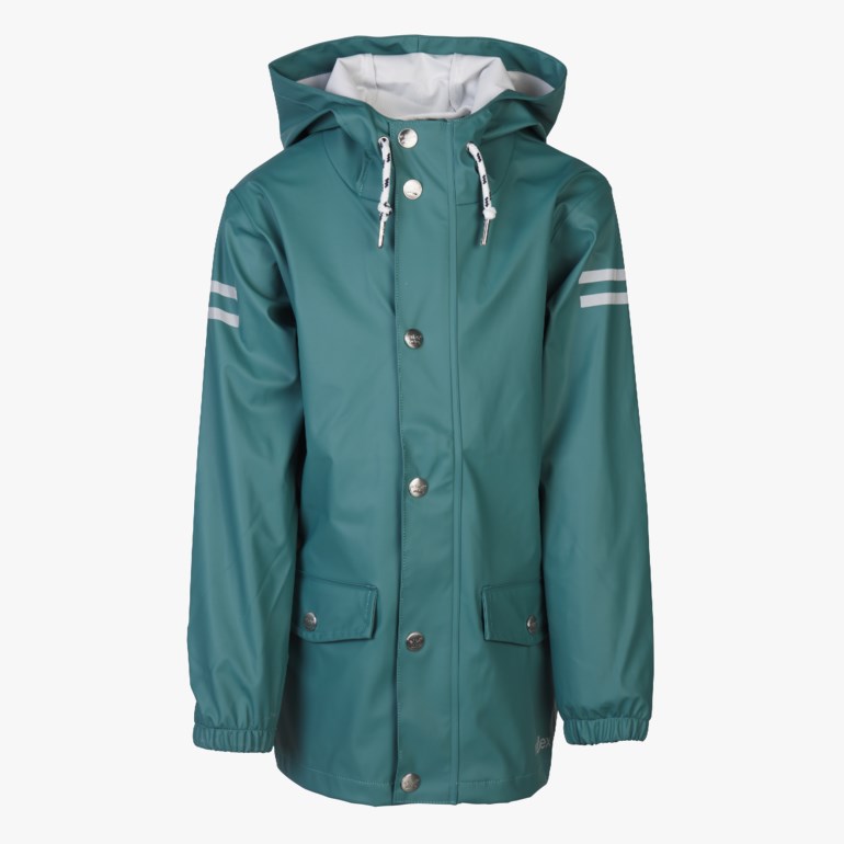 Klassisk regnjakke med moderne snitt for de litt større barna. Laget i myk og behagelig PU-kvalitet med resirkulert backingmateriale.