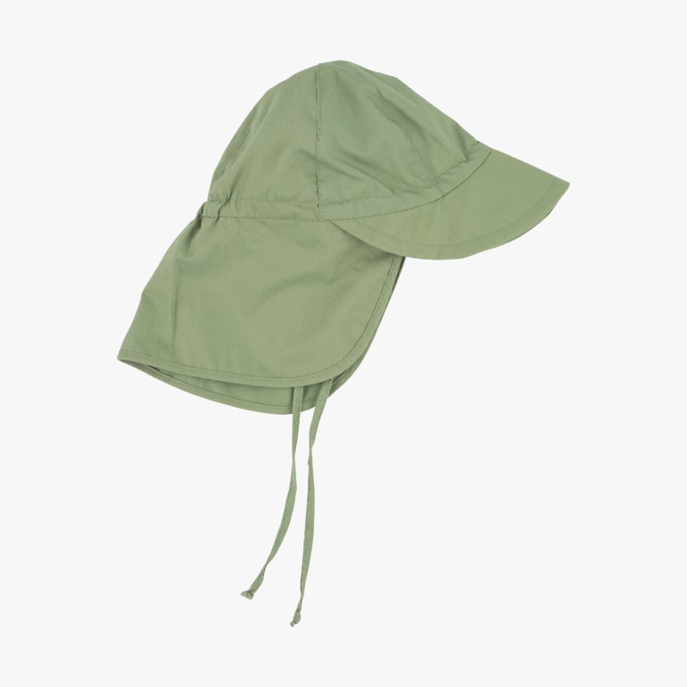 Med øreklaff og knyting som gjør at solhatten sitter ekstra godt på hodet.