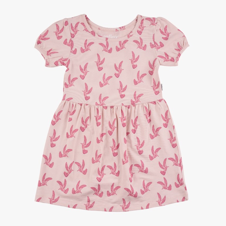 Sommerlige, kortermede kjoler med print, til hverdag og fest. Laget i økologisk bomull som er delikat og myk mot huden og holder godt på fasongen. GOTS & Økotex-sertifisert produkt uten skadelige kjemikalier eller allergifremkallende stoffer. Str 74-80 cm 9-12 mnd – 122-128 cm 7-8 år. Materiale: 95% bomull, 5% spandex. Vaskeanvisning: Maskinvask 30 grader. For å ivareta både plagget og miljøet så godt som mulig, anbefaler vi å minimere antall vask så mye man kan. Vask gjerne av flekker med en klut og heng plagget til lufting når nødvendig. Dette vil forlenge levetiden på plagget, minimere energibruk samt skåne miljøet for unødvendig utslipp.