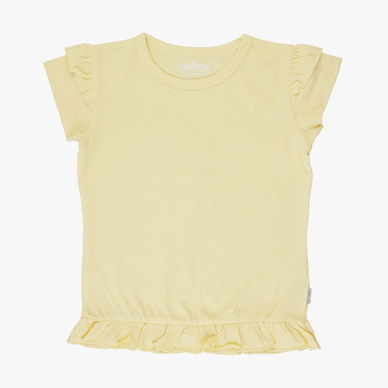 Ensfarget t-skjorte med blonde- og rysjedetaljer på skuldrene, laget av myk, økologisk bomull.