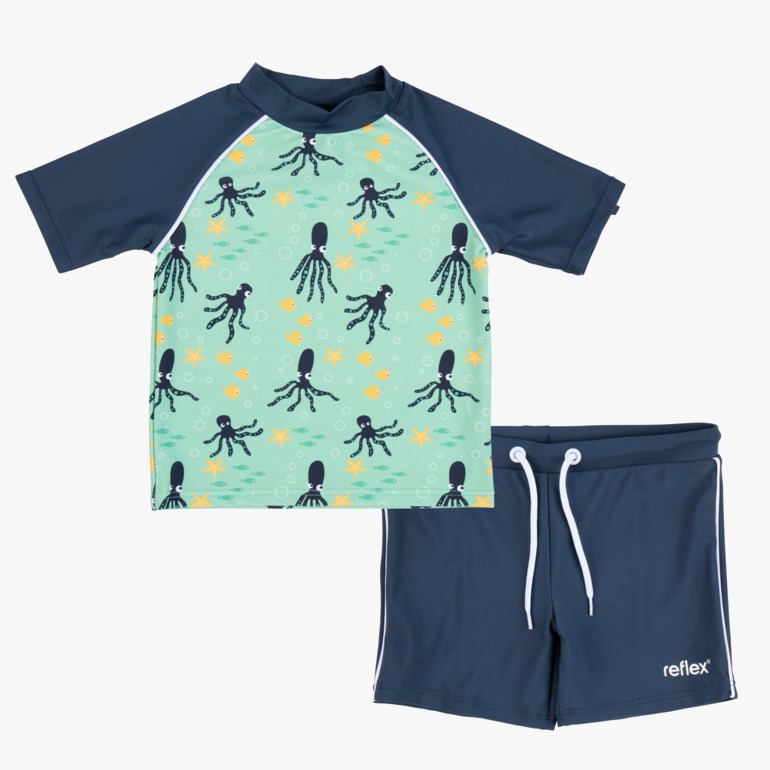 - Overdel med korte ermer og tilhørende badeshorts med snøring i livet.