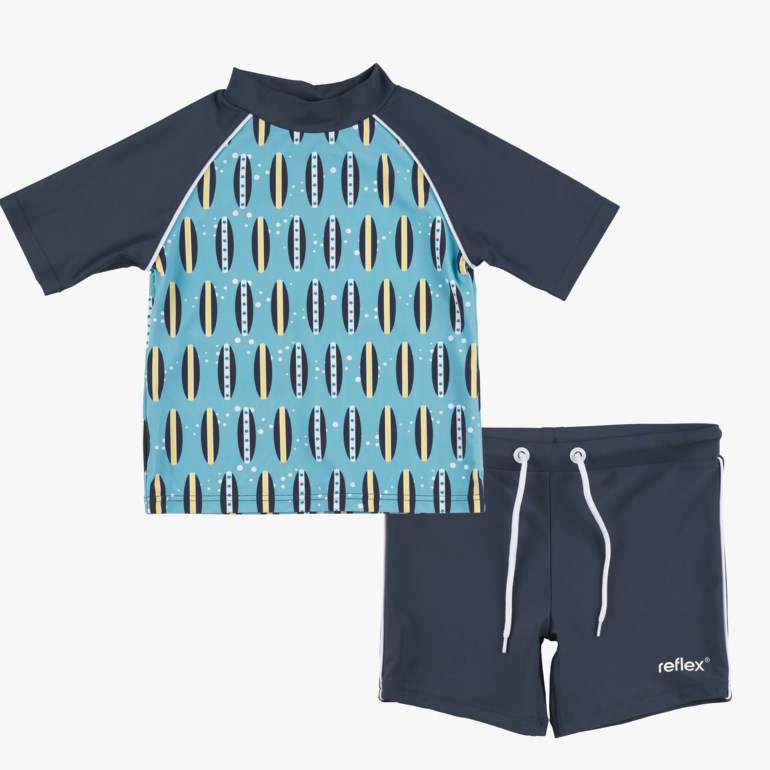 UV-beskyttende, todelt badesett laget av resirkulert polyamid. Innslag av elastan gjør badedrakten ekstra fleksibel og behagelig. Overdelen har korte ermer og badeshortsen snøring i livet. Navnelapp i både bukse og overdel.