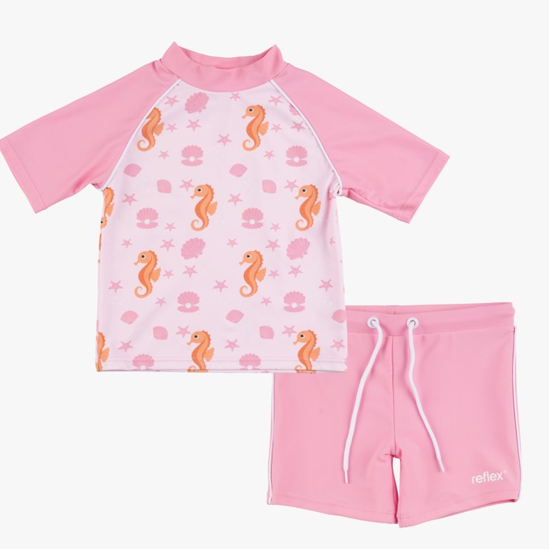 UV-beskyttende, todelt badesett laget av resirkulert polyamid. Innslag av elastan gjør badedrakten ekstra fleksibel og behagelig. Overdelen har korte ermer og badeshortsen snøring i livet. Navnelapp i både bukse og overdel.
