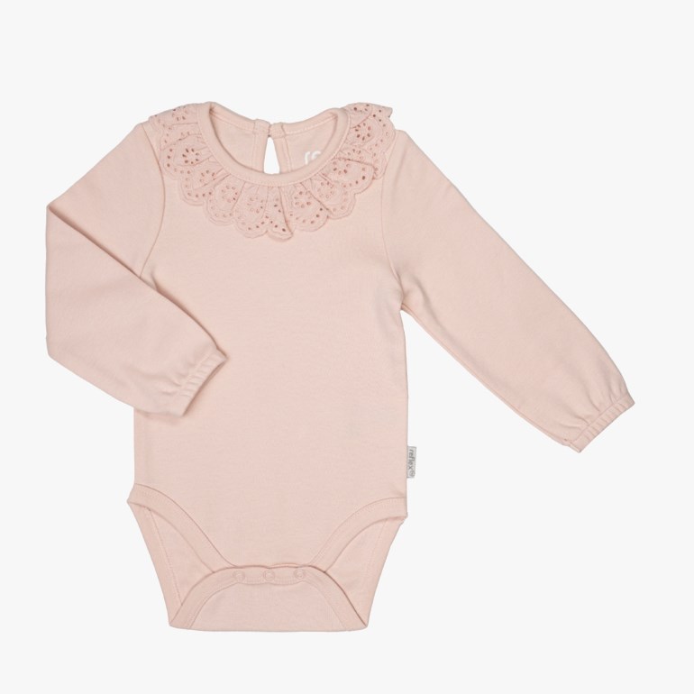 Søt, ensfarget body med blonde- og rysjedetaljer, laget av 100% myk, økologisk bomull.