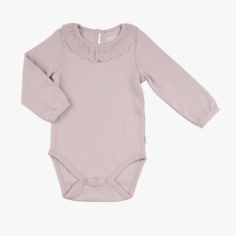 Søt, ensfarget body med blonde- og rysjedetaljer i myk, økologisk bomull. Åpning med trykknapper på skulder og i skrittet. Søte blonde- og rysjedetaljer på skuldre, ermer og i halsåpning. GOTS & Økotex-sertifisert produkt uten skadelige kjemikalier eller allergifremkallende stoffer. Str 50 cm Nyfødt – 92 cm 2 år. Materiale: 100% økologisk bomull. Vaskeanvisning: Maskinvask 30 grader. For å ivareta både plagget og miljøet så godt som mulig, anbefaler vi å minimere antall vask så mye man kan. Vask gjerne av flekker med en klut og heng plagget til lufting når nødvendig. Dette vil forlenge levetiden på plagget, minimere energibruk samt skåne miljøet for unødvendig utslipp.