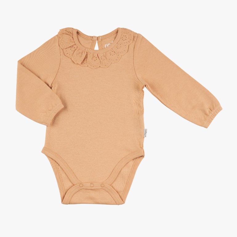 Søt, ensfarget body med blonde- og rysjedetaljer i myk, økologisk bomull. Åpning med trykknapper på skulder og i skrittet. Søte blonde- og rysjedetaljer på skuldre, ermer og i halsåpning. GOTS & Økotex-sertifisert produkt uten skadelige kjemikalier eller allergifremkallende stoffer. Str 50 cm Nyfødt – 92 cm 2 år. Materiale: 100% økologisk bomull. Vaskeanvisning: Maskinvask 30 grader. For å ivareta både plagget og miljøet så godt som mulig, anbefaler vi å minimere antall vask så mye man kan. Vask gjerne av flekker med en klut og heng plagget til lufting når nødvendig. Dette vil forlenge levetiden på plagget, minimere energibruk samt skåne miljøet for unødvendig utslipp.