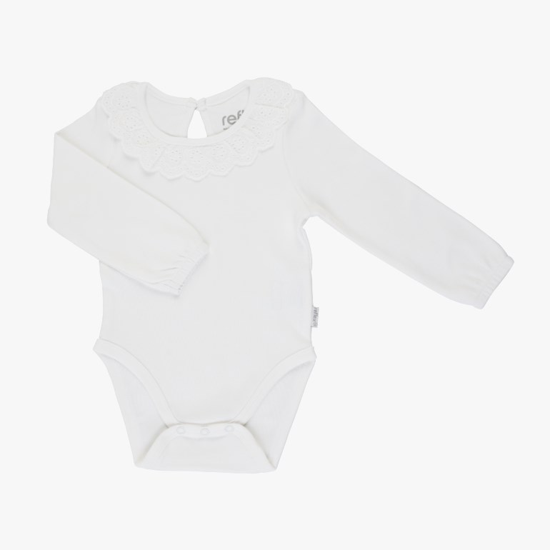 Søt, ensfarget body med blonde- og rysjedetaljer, laget av 100% myk, økologisk bomull.
