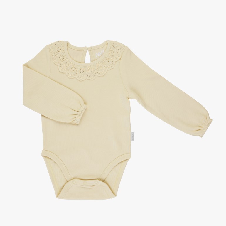 Søt, ensfarget body med blonde- og rysjedetaljer, laget av 100% myk, økologisk bomull.