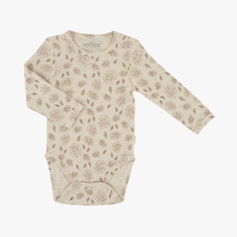 Åpning med trykknapper på skulder og i skrittet. Finnes med og uten print. GOTS & Økotex-sertifisert. Str 50cm Nyfødt – 92cm 2 år. Materiale: 100% økologisk bomull.