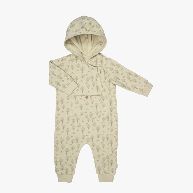 Printet heldress med hette, lomme og åpning i front. Laget av myk, økologisk bomull.
