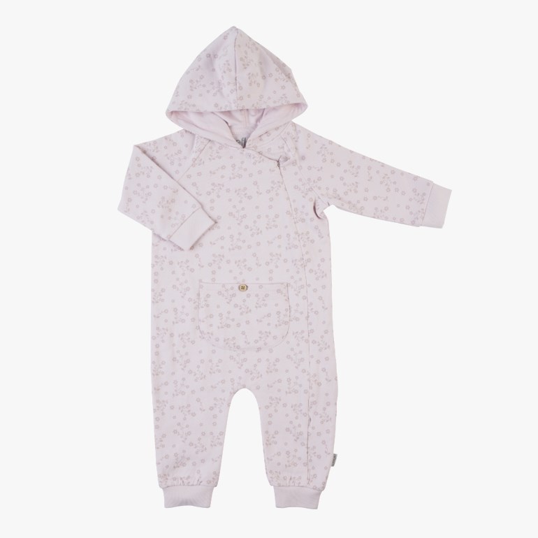 Printet heldress med hette, lomme og åpning i front, laget av myk, økologisk bomull.