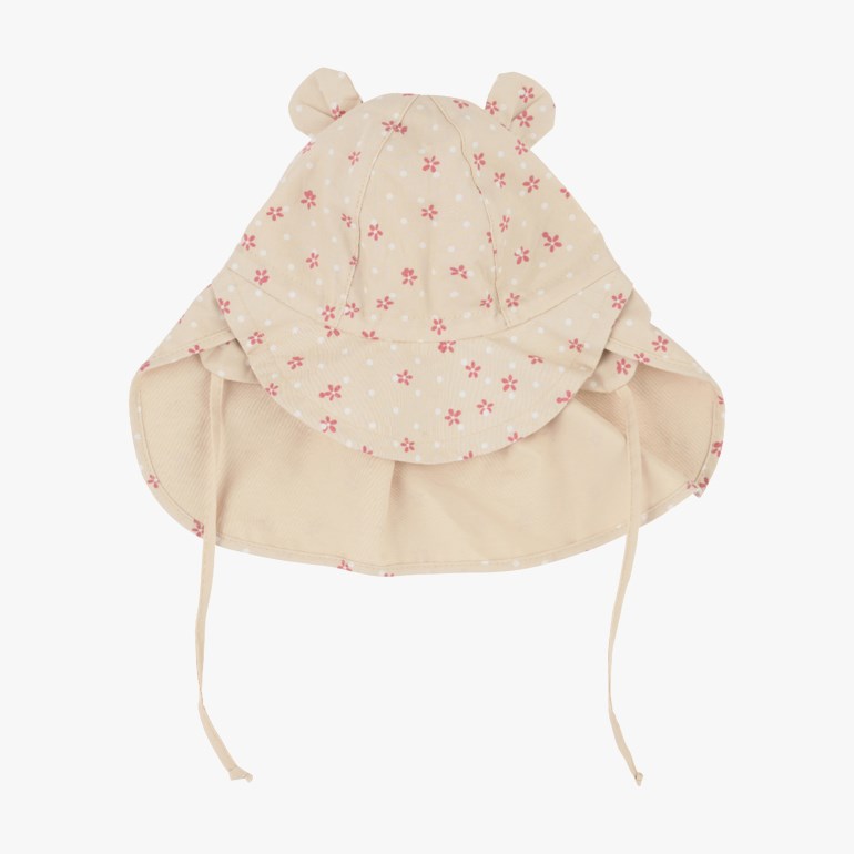 Med øreklaff og knyting som gjør at solhatten sitter ekstra godt på hodet.