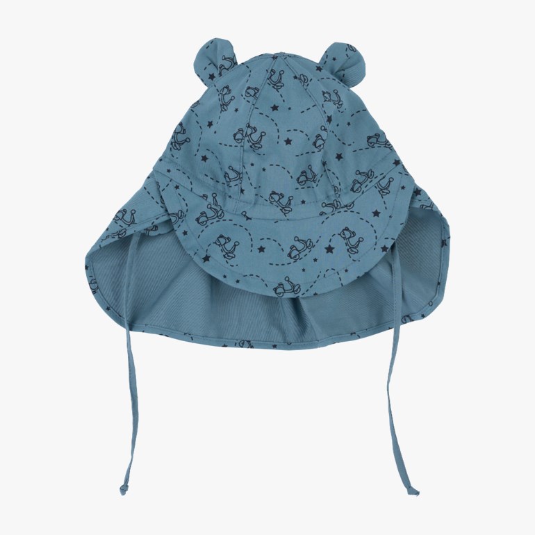 Med øreklaff og knyting som gjør at solhatten sitter ekstra godt på hodet.