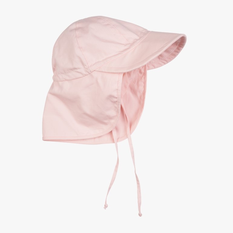 Med øreklaff og knyting som gjør at solhatten sitter ekstra godt på hodet.