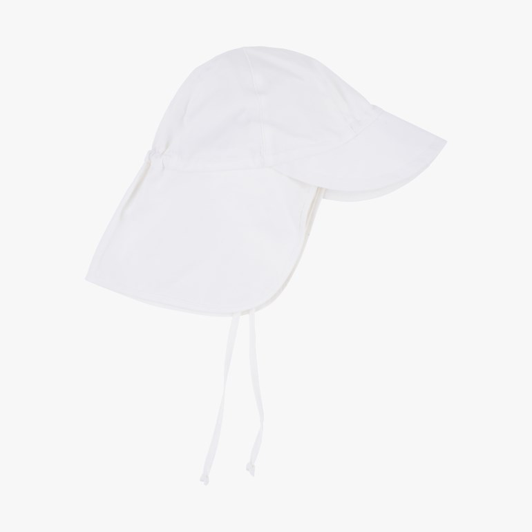 Med øreklaff og knyting som gjør at solhatten sitter ekstra godt på hodet.