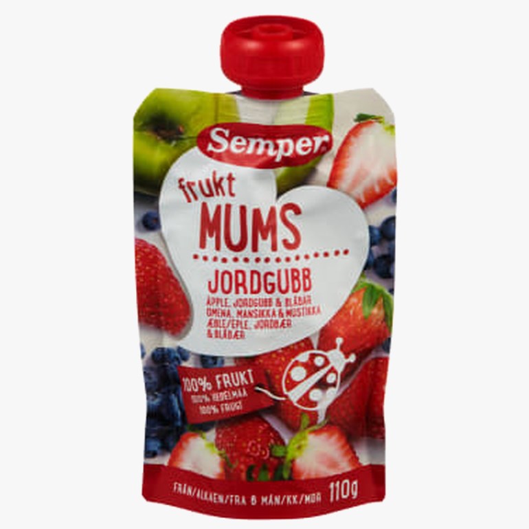 Fruktmums med smak av jordbær, eple og blåbær er en praktisk og smakfull puré for barn fra 6 måneder. Klemmeposen gjør den enkel å ta med, og puréen kan spises kald eller varmes etter ønske.
