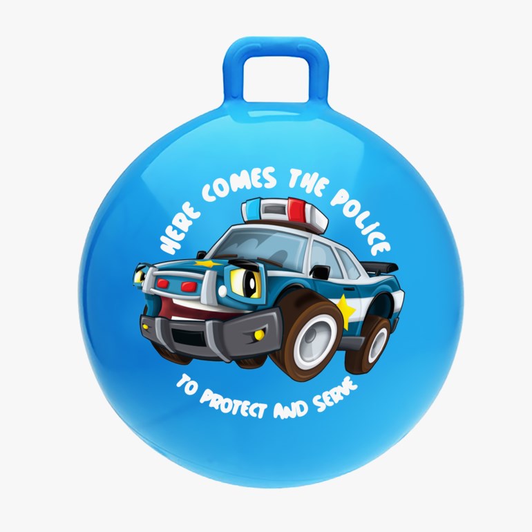 Oppblåbar hoppeball med håndtak i toppen. Kommer i sterke, fine farger med morsomme motiver. Morsom til lek både innendørs og utendørs. Måler 45 cm, leveres flatpakket.