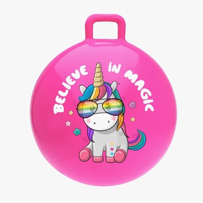 Oppblåbar hoppeball med håndtak i toppen. Kommer i sterke, fine farger med morsomme motiver. Morsom til lek både innendørs og utendørs. Måler 45 cm, leveres flatpakket.